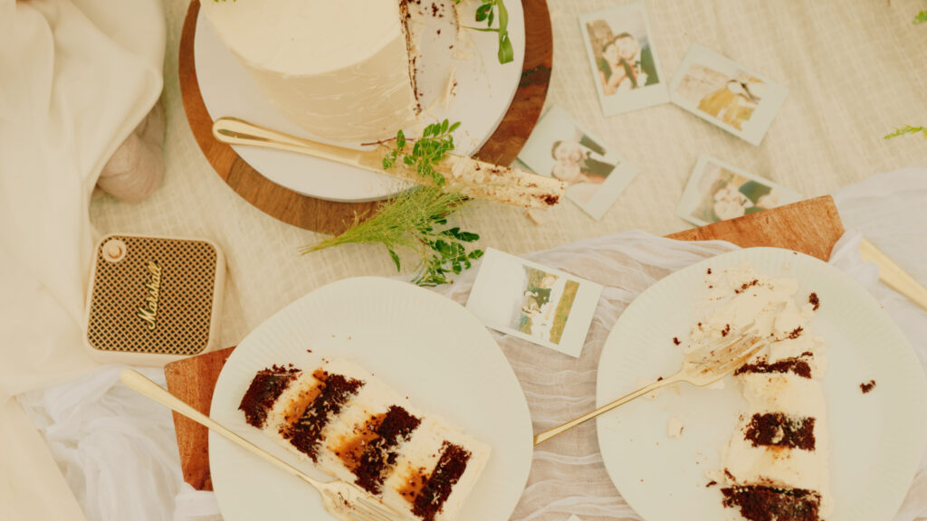 Another location, a slower pace. A picnic set up with cake, pizza, and bubbles. Shoes off, sitting in the grass, taking in the scale of everything around them. The kind of moments that don’t feel staged, just lived.