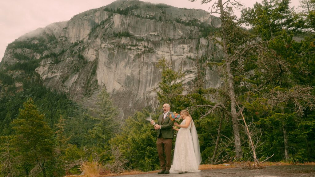 To finish the day, we hiked up to Malamute Summit, carrying champagne and taking our time as the weather continued to shift around us. At the top, Em and Eoin shared a first dance and popped champagne with sweeping views over Squamish, ending the day in a way that felt intentional, quiet, and completely earned. It was the kind of ending that makes hiking elopements in Squamish so memorable.